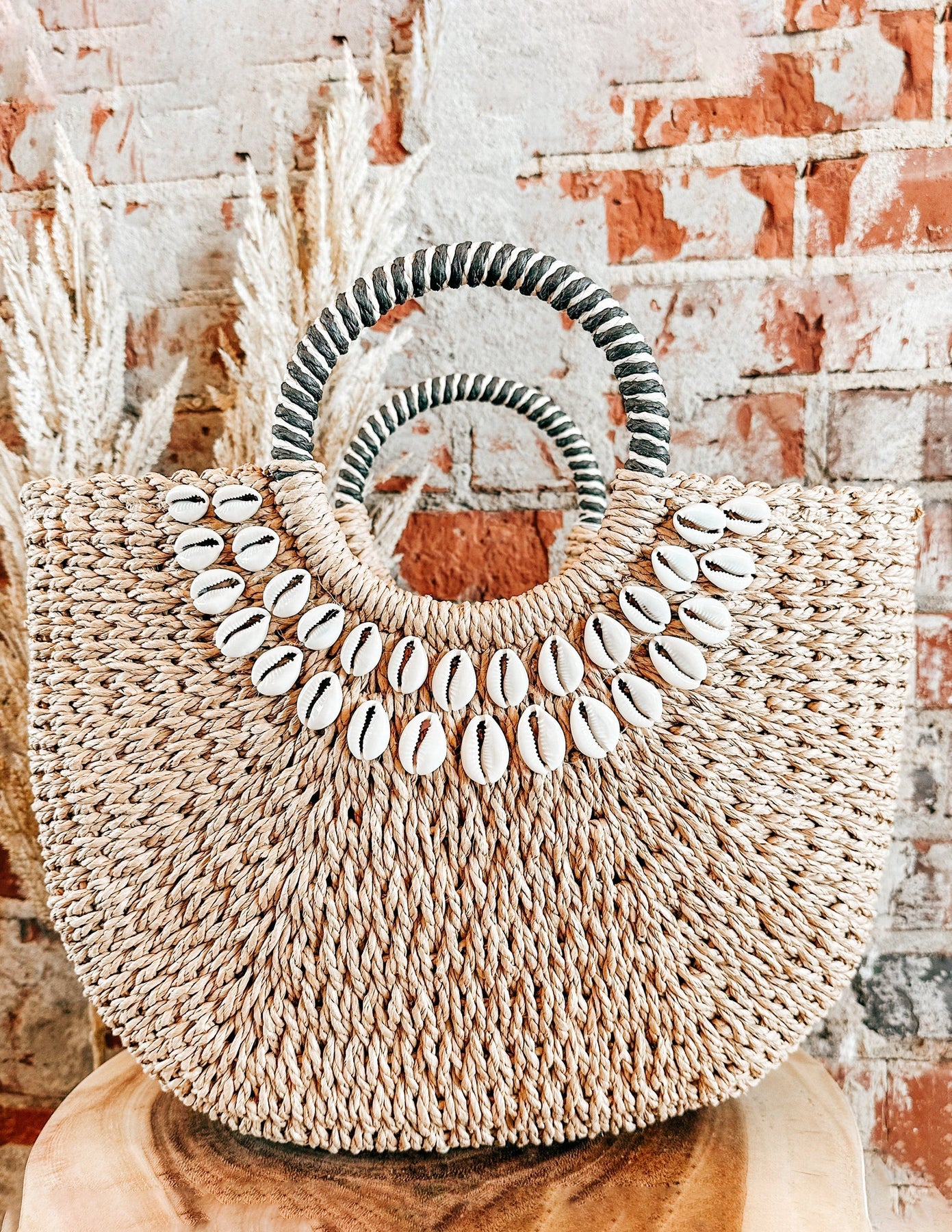 A charming straw bag adorned with delicate shell accents and handmade details for a touch of coastal elegance