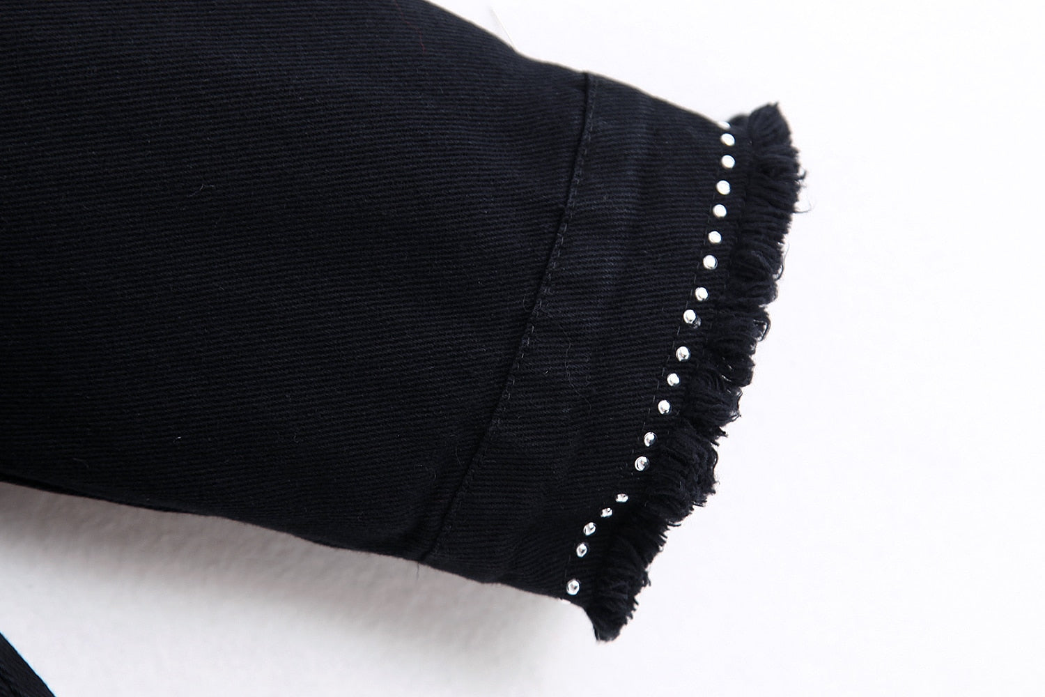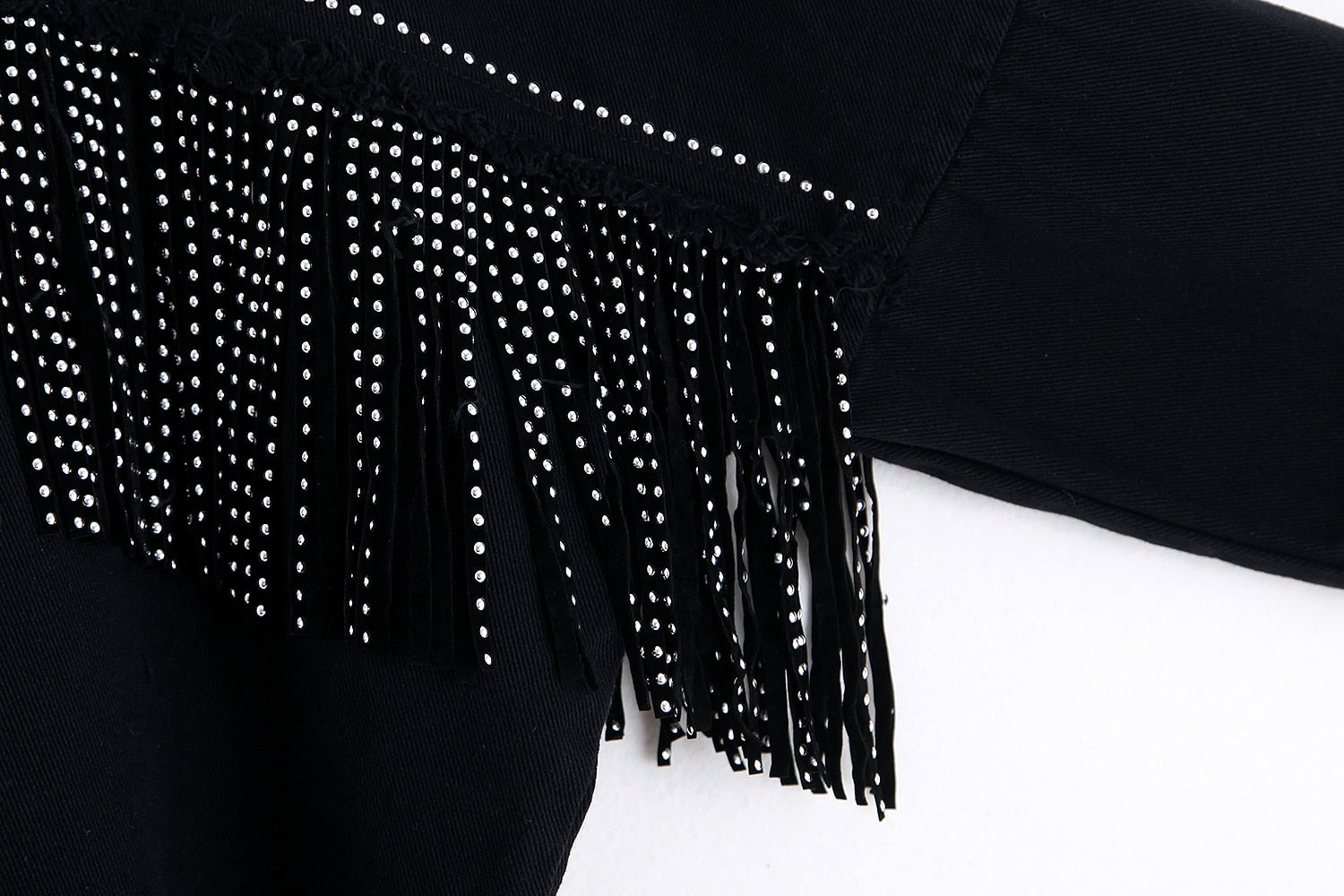 Premium black women's denim jacket from the Gusaino collection. Made from classic high-quality denim, with tassels. The design fits various stylings, feel free to match it with jeans or a T-shirt.