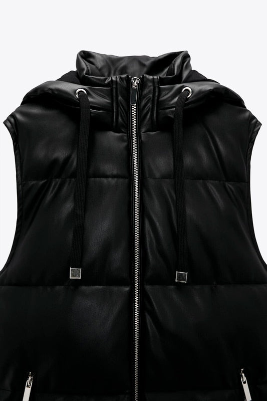 Premium women's black leather coat from the Gusaino collection. Made from classic high-quality faux leather with cotton filling.